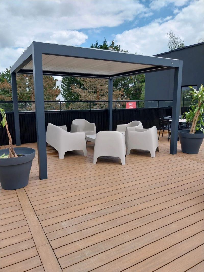 - Perolas à toile ou à lames fixes : Pour une protectionplus classique mais tout aussi efficace, nous vous proposons des pergolas à toile ou à lames fixes. Elles créent un coin d’ombre agréable pour vos repas ou moment de lecture , tout en apportant une touche de modernité à votre extérieur.