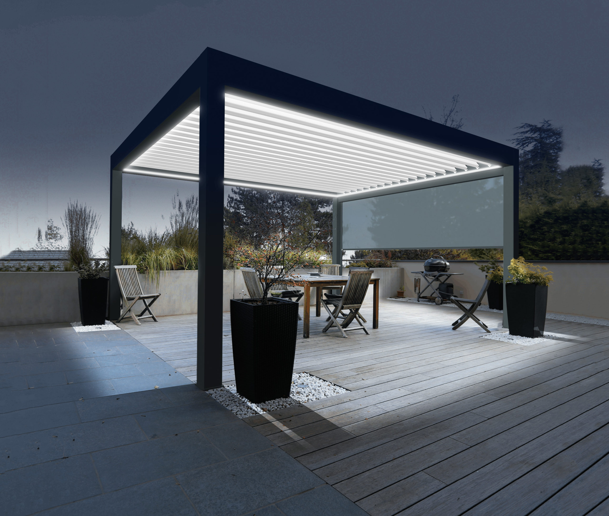 Nos pergolas bioclimatiques peuvent être équipées d’options comme l’éclairage LED, le chauffage d’appoint ou des capteurs de pluie pour un confort optimal, géré automatiquement où à distance.